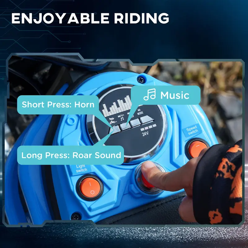 Turn your teens’ usual outdoor outings into thrilling adventures with our motorized bike. Designed for ages 13 and up, this powerful 24V motorbike offers variable speeds between 6.2 and 14.9 mph for up to 30 minutes of non-stop fun. With a strong steel frame, shock-absorbing wheels, and manual throttle, this bike is great for tackling any terrain. So, blast the tunes and get ready to make memories that will last a lifetime.Features:● Manual throttle control with variable speed and a mechanical brake for precise control;● Powerful 24V motor reaching speeds between 6.2 and 14.9 mph for up to 30 minutes of fun;● Enjoy riding with built-in music, a horn, an engine roar and lights;● 12″ pneumatic rubber wheels with shock absorption for smooth rides on uneven roads;● Made with a stereoscopic reinforced steel frame, it offers enhanced durability;● Foldable footrest for added convenience;● Assembly required; Specifications:● Color: Green;● Materials: Polypropylene, Steel;● Overall Dimensions: 46.75″ L x 25.25″ W x 30″ H;● Seat Size: 19″ L x 6.5″ W x 19.75″ H (Off the Ground);● Charging Time: 8-12 hours;● Battery: 12V 10AH;● Motor: 24V 350W;● Run Time: 30 min;● Speed: 6.2 – 14.9 MPH;● Wheels Diameter: Dia. 12;● Weight Capacity: 143 lbs.;● Qualification Age/ Recommended Age: over 13 years old;● Qualification: ASTM F2641, ASTM F2642; CPSIA;● Item Label: 370-304V80GN;● Note: Always monitor your children while they are riding;