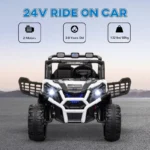Features: ·Powerful 24V 4-wheel drive for thrilling off-road adventures;·Spacious two-seater allows two kids to share the driving fun;·Extendable body length grows with your child for years of enjoyment;·Dual control modes offer kids freedom and parents remote-control safety;·Soft start and rear suspension provide a smooth riding experience on various surfaces;·Bright lights and a music player for an immersive driving atmosphere;·The openable front hood offers storage for toys and accessories;·Assembly required;Specifications:·Color: White;·Material: PP, Metal;·Overall Dimensions: 43.9″ -49.8″ L x 29.9″ W x 31.1″ H;·Seat Size: 7.5″ L x 20.1″ W x 9.6″ D;·PP Wheel Size: 12.6″ Dia.;·Speed: 1.9-5 mph;·Remote Distance: 49.2′;·Battery: 2 x 12V 7AH;·Motor: 4 x 24V;·Run Time: 45 minutes;·Recommended Age: 37-95 months;·Maximum Load: 132 lbs.;·Item Label: 370-390V80WT.